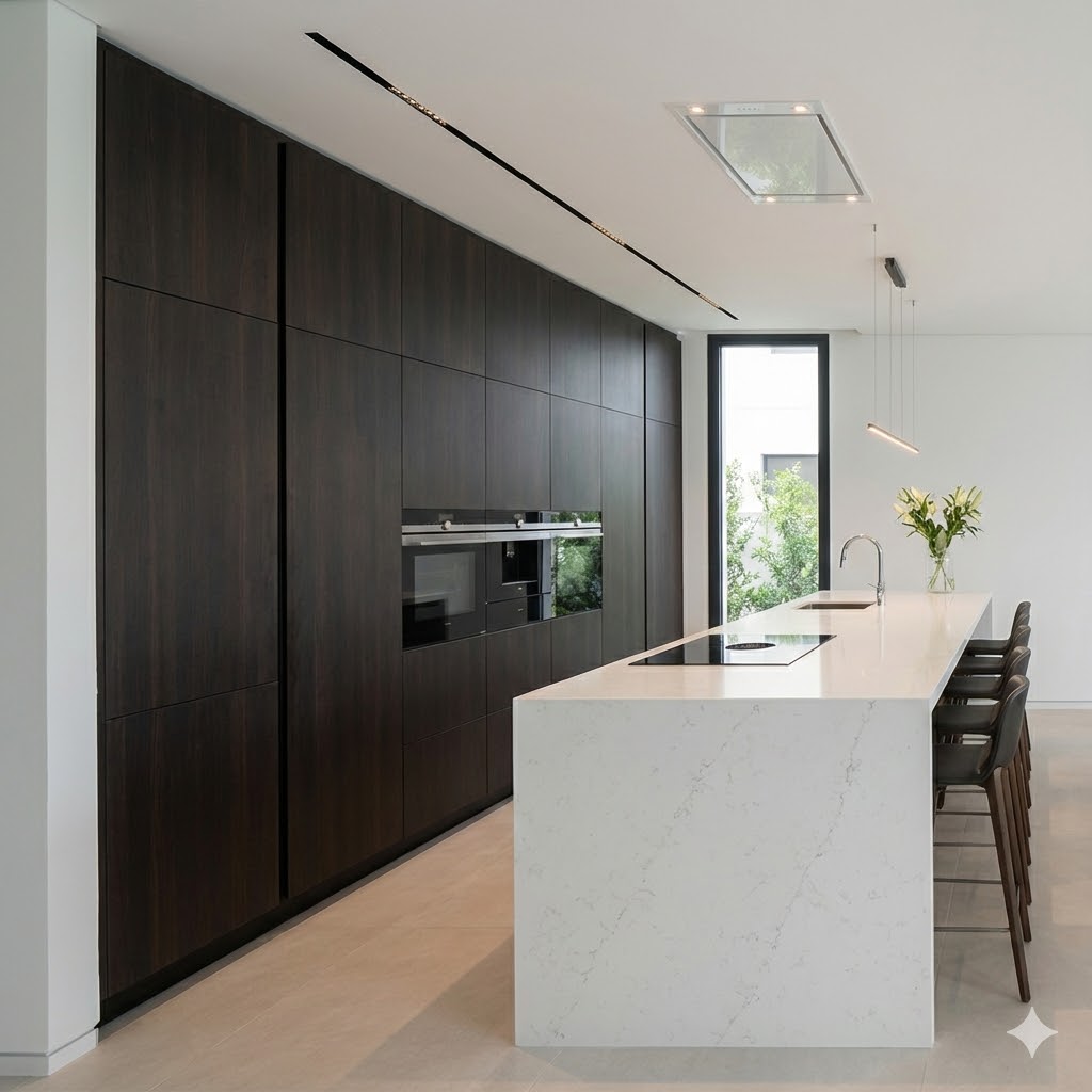 Brüt betonun güçlü duruşu, sıcak ahşap detaylar ve cepheyi kaplayan devasa cam yüzeylerle yumuşatılmıştır. 6 metre tavan yüksekliğine sahip galeri boşluklu salon, iç mekan ile dış mekan arasındaki sınırları kaldırır. Özel tasarım ada mutfak, spa konseptli ebeveyn banyoları ve her odadan çıkılabilen geniş teraslar, yaşam kalitenizi en üst düzeye çıkarmak için kurgulanmıştır.